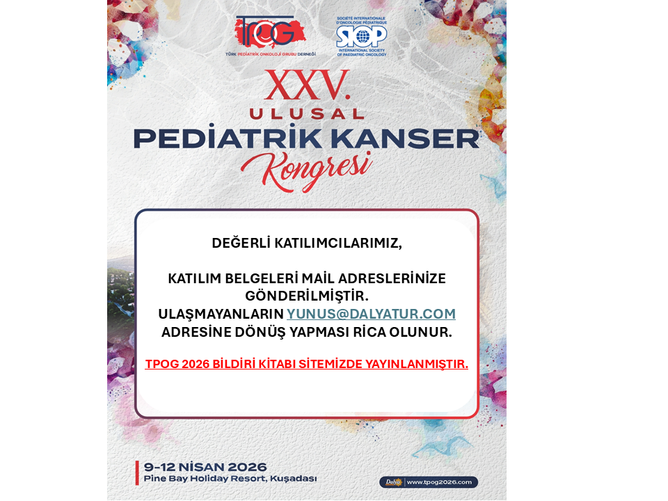 XXV. Türk Pediatrik Onkoloji Grubu (TPOG) Ulusal Pediatrik Kanser Kongresi, 09-12 Nisan 2026 tarihleri arasında Pine Bay Holiday Resort -Kuşadası’nda yapılacaktır.